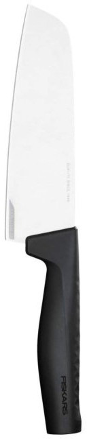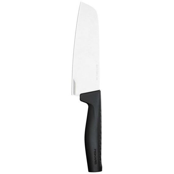 Сантоку Fiskars Hard Edge - нож общего назначения в азиатском стиле, для любых задач на кухне. Лезвия ножей изготовлены из японской нержавеющей стали с технологией LZR-EDGE на режущей кромке, которая обеспечивает остроту ножей в 4 раза дольше, по сравнению с другими ножами Fiskars. Длина лезвия 161 мм., твердость HRC 52. Рукоятка с эргономичным дизайном и трехмерным рисунком обеспечивает комфортный захват, есть специальный упор для защиты пальцев. Новая экологичная упаковка изготовлена из картона, и только тонкая пленка пластика используется для герметизации упаковки. Такая упаковка может быть полностью переработана вместе с картонными отходами. Рекомендуется заточка с помощью точилки Fiskars Roll-Sharp или точильного камня с углом 30+/-4. Ножи можно мыть в посудомоечной машине, однако для продления срока службы инструмента рекомендуется ручная мойка. Ножи Fiskars Hard Edge получили высокую оценку производительности резки (по результатам CATRA теста). Разработаны в Финляндии