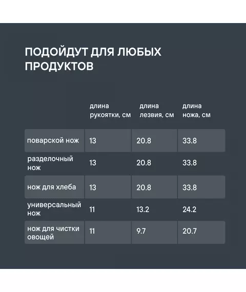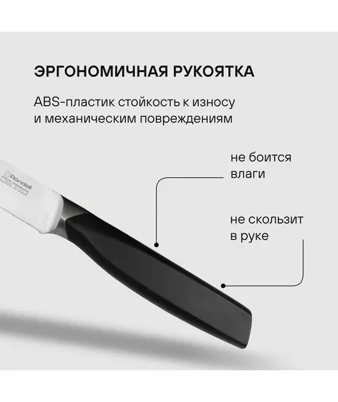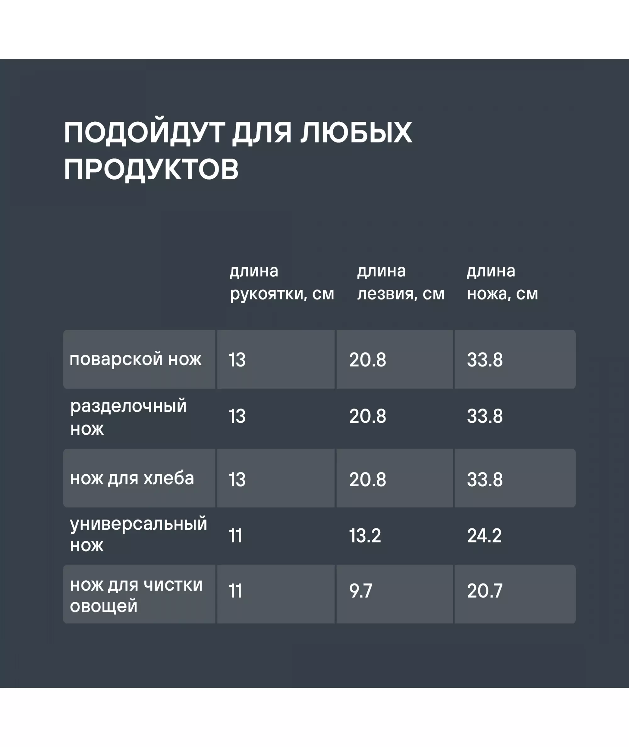 | Состав комплекта | Нож для овощей, нож для хлеба, разделочный нож, универсальный нож, поварской нож, подставка |