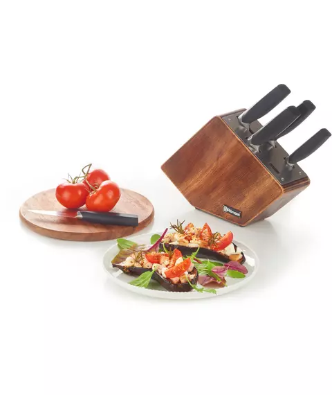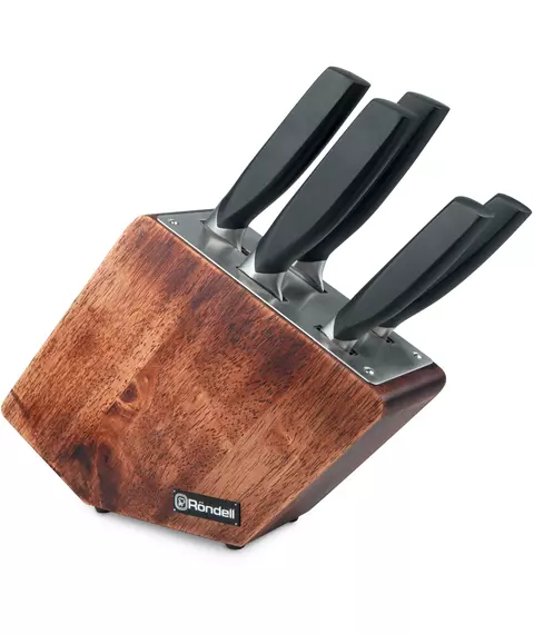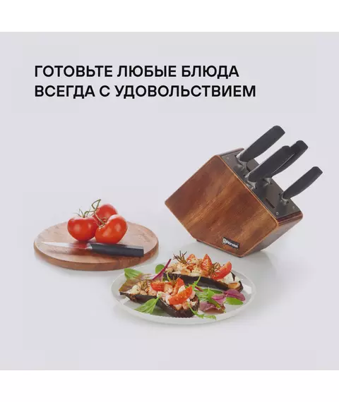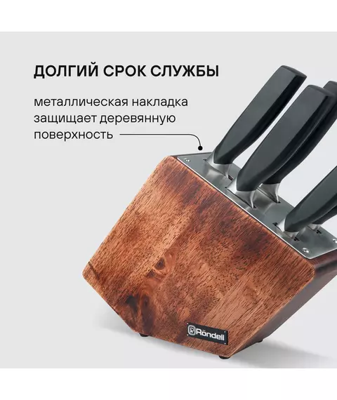| Особенности | В набор включена стильная деревянная подставка в цвет благородного темного ореха. Для каждого ножа выделено собственное отверстие. А уникальная металлическая накладка на ней не только является элементом декора, но и защищает деревянную поверхность от воздействия лезвий. |
