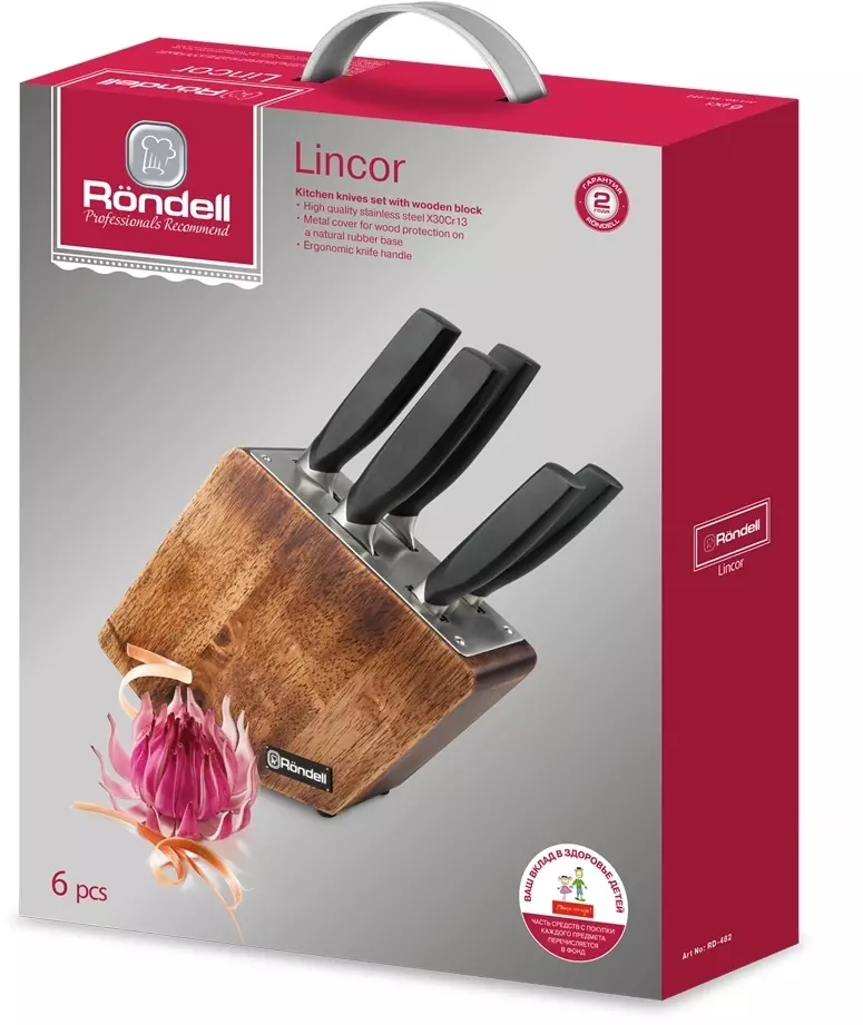 Набор ножей Lincor выполнен из нержавеющей стали. Она не подвергается ржавлению, не образуется неприятных следов на лезвии. На длительное время ножи сохранятся в первоначальном состоянии. Сталь обладает высокой твердостью. За счет этого она хорошо держит заточку, ножи дольше сохраняют остроту.