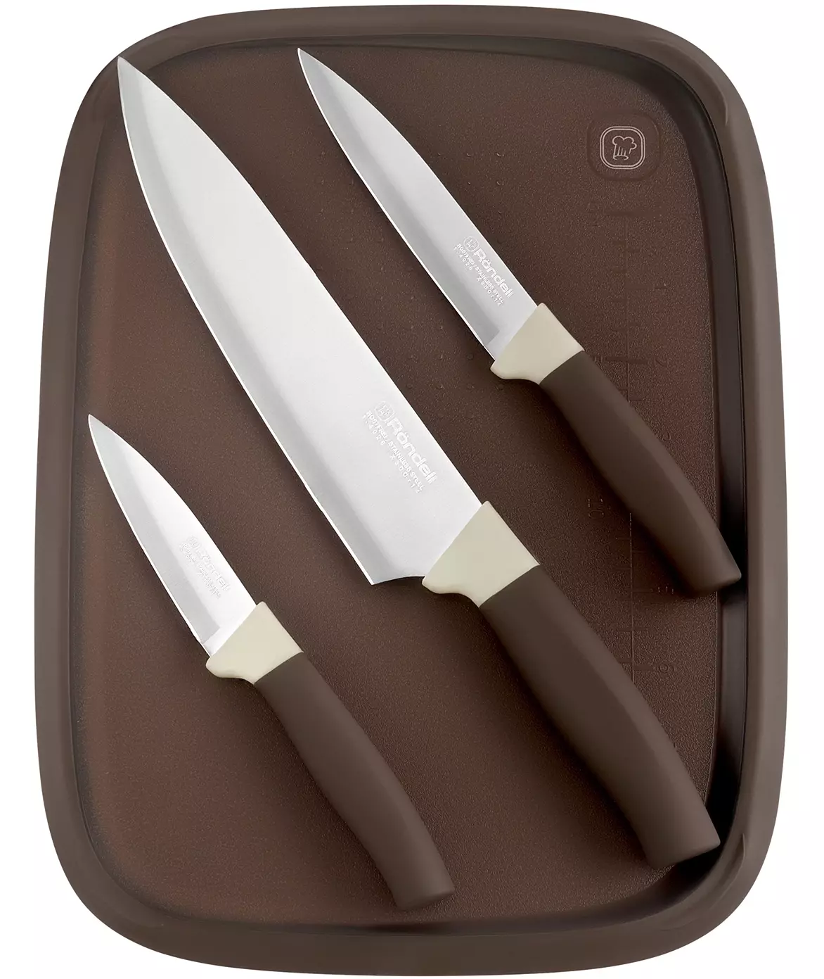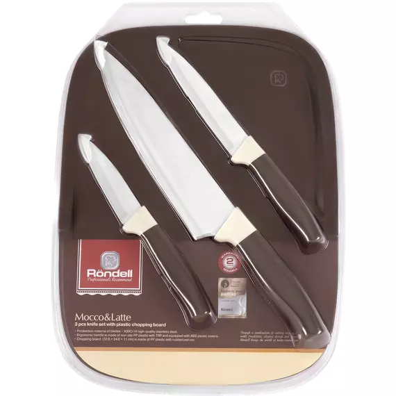 Всеми любимая коллекция Mocco&Latte от Rondell - благородный стиль и качество. Лезвия ножей изготовлены из высококачественной нержавеющей стали X30Cr14, что обеспечивает надежность и долговечность изделий. Разделочная доска надежно фиксируется на поверхности — она оборудована прорезиненным ободом.