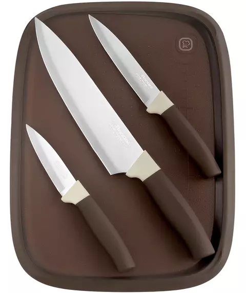 | Особенности | Клинок – сталь X30Cr14, рукоятка - полипропилен и вставка из ABS пластика. Доска 32,6 * 24,6 * 1,1 см - полипропилен с прорезиненным ободом. Ножи не подходят для ПММ. Доска подходит для ПММ |