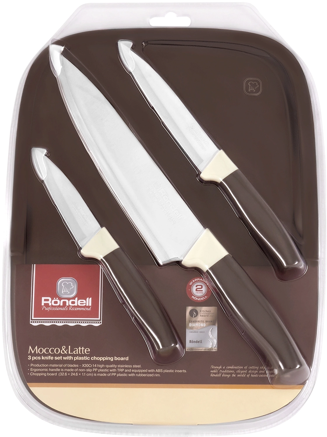 Всеми любимая коллекция Mocco&Latte от Rondell - благородный стиль и качество. Лезвия ножей изготовлены из высококачественной нержавеющей стали X30Cr14, что обеспечивает надежность и долговечность изделий. Разделочная доска надежно фиксируется на поверхности — она оборудована прорезиненным ободом.