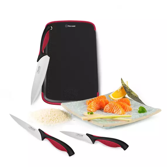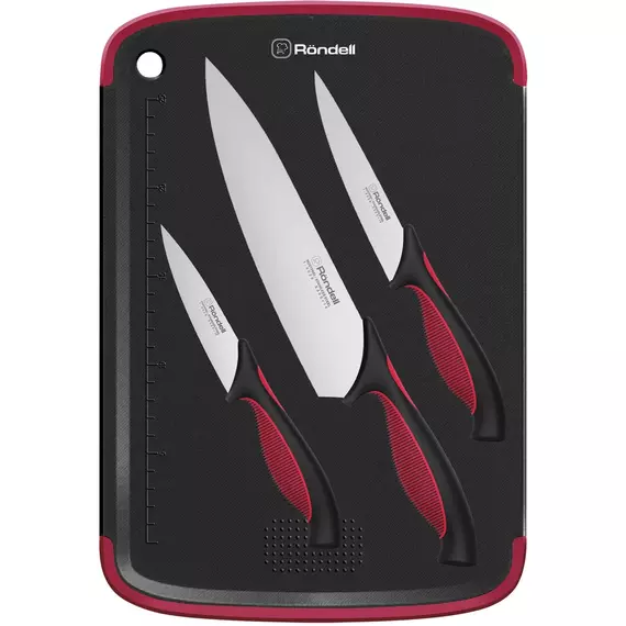 | Особенности | Высококачественная нержавеющая сталь X30Cr14. Особенности клинка: двусторонняя заточка лезвий. Материал рукотяки: ударопрочный полипропилен с прорезиненными вставками, препятствующими скольжению. Разделочная доска из полипропилена с отверстием для подвешивания и желобом для слива излишней жидкости |