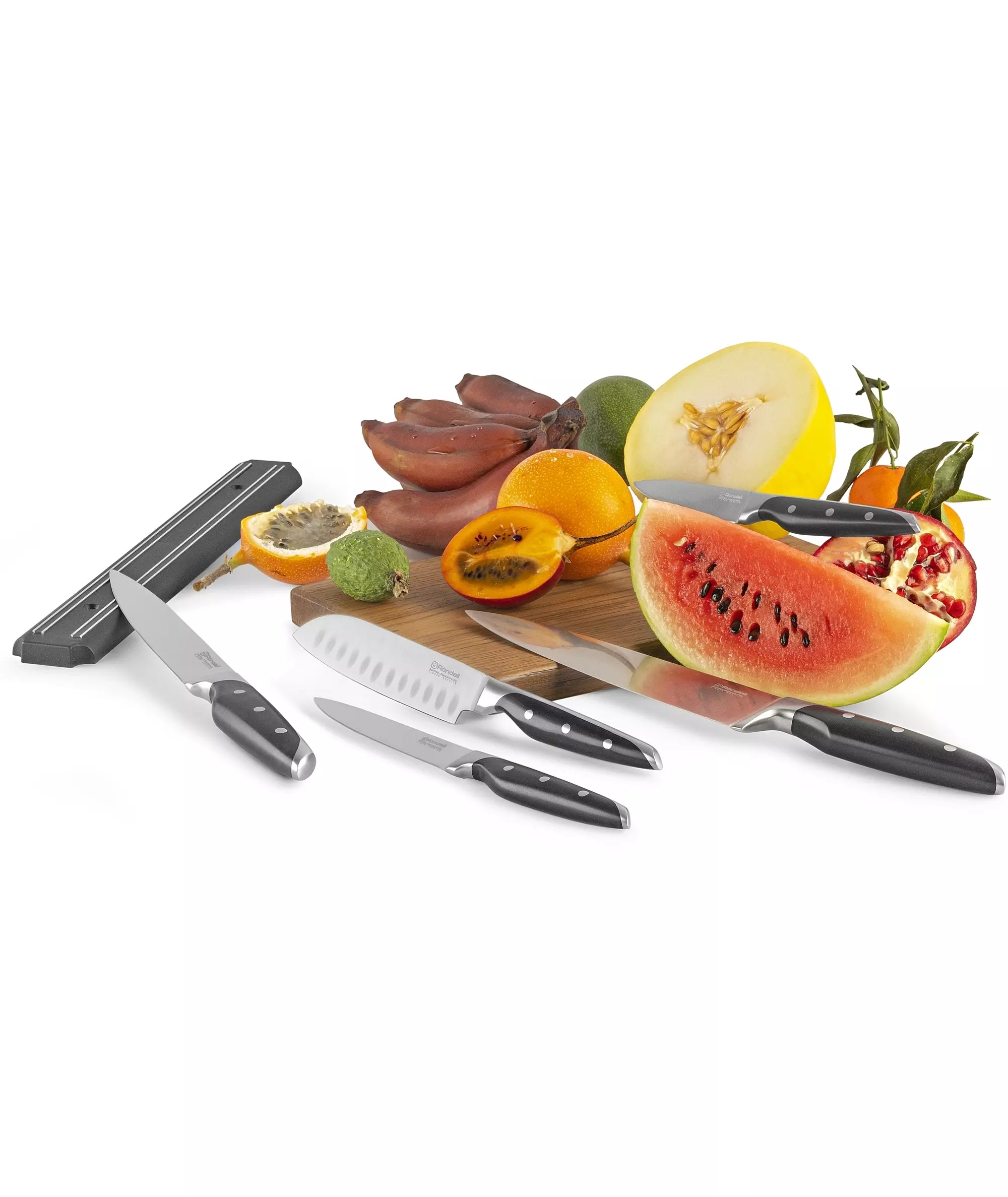 | Состав комплекта | Нож поварской - 20 см, нож разделочный - 20 см, нож универсальный - 12,7, нож сантоку - 12,7 см и нож для чиски овощей - 9 см, магнитный держатель |