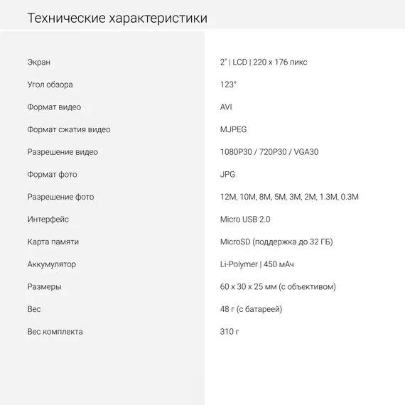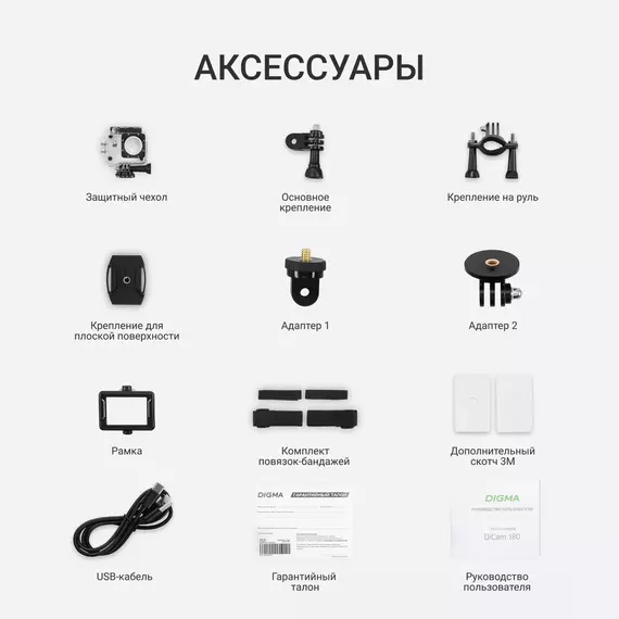 | Другие аксессуары в комплекте | Основное крепление, Крепление для шлема, Крепление для штатива, Адаптер-кронштейн-1, Адаптер-кронштейн-2, Клей, Зажимы, Повязка-бандаж |