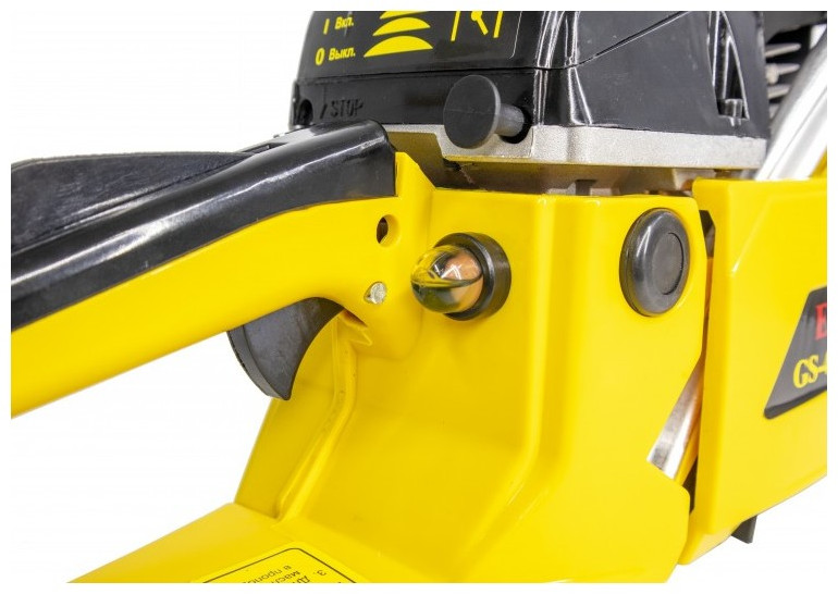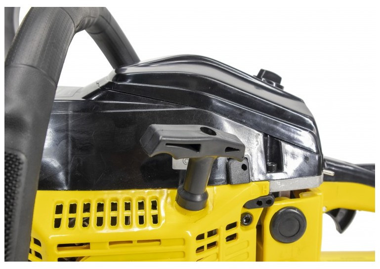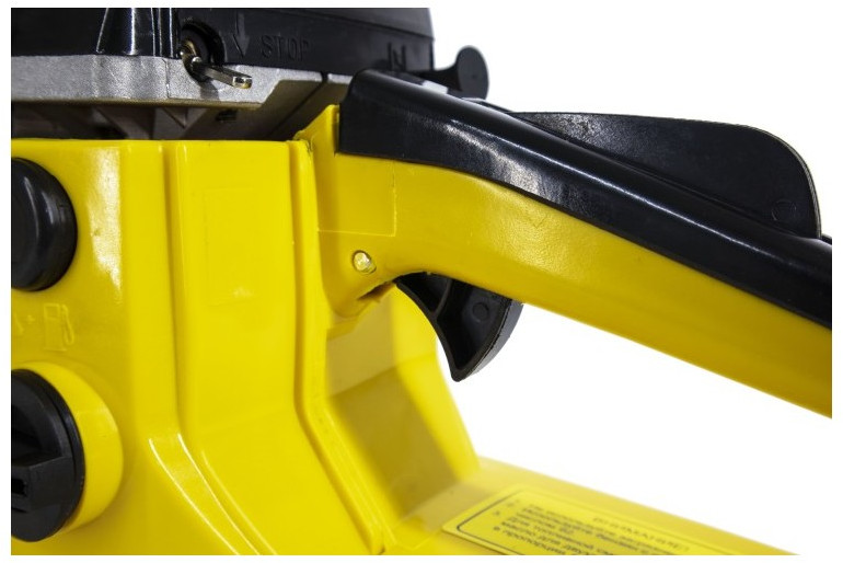 - Особое внимание уделено безопасности. За счет специальной кнопки бензиновой цепной пилы обеспечивается блокировка от случайного включения.