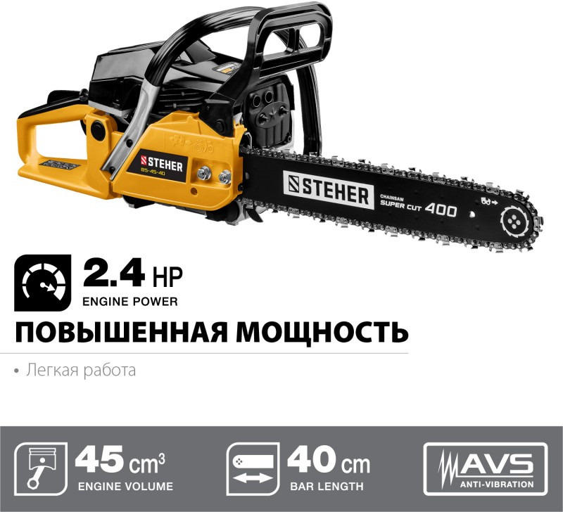 - Тормоз мгновенного действия обеспечивает высокую безопасность работ, мгновенно останавливая пильную цепь в случае опасности