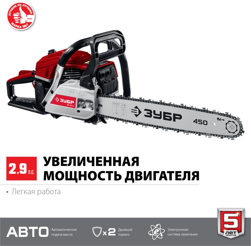 - Идеальный вариант для пиления досок, бруса, стволов различных пород дерева на дачном участке. В отличие от электрической, бензиновая пила оснащена более мощным двигателем, безопасна в отношении поражения электрическим током, может работать в любую погоду и в любом месте. Функции легкого запуска, автоматической смазки цепи и эффективная антивибрационная защита делают пилу легкой в обращении и комфортной в работе. Двойной тормоз цепи, приводимый в действие при откидывании защитного щитка или при отпускании клавиши блокировки на рукоятке, а также встроенный цепеуловитель и металлический упор делают пилу безопасной в применении. Большая удельная мощность, высокое качество применяемых материалов и изготовления, обеспечивающие увеличенный ресурс, делают бензиновую пилу ЗУБР Вашим лучшим помощником. Обратите внимание, что рекомендуемая пильная гарнитура ЗУБР устанавливается только комплектом