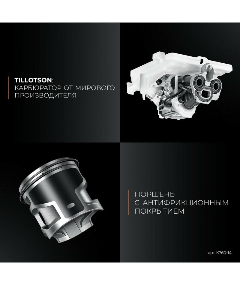 - Карбюратор TILLOTSON оснащен компенсационным клапаном, обеспечивающим высокую мощность даже при забитом воздушном фильтре