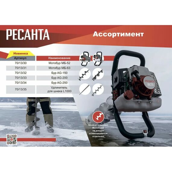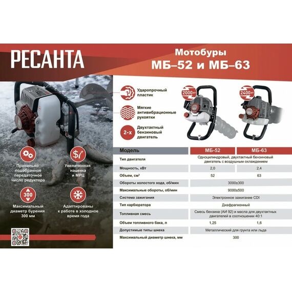 Бензиновый Мотобур РЕСАНТА МБ 52 - это удобный инструмент для работы с грунтом и льдом, например, в строительстве или зимней рыбалке.