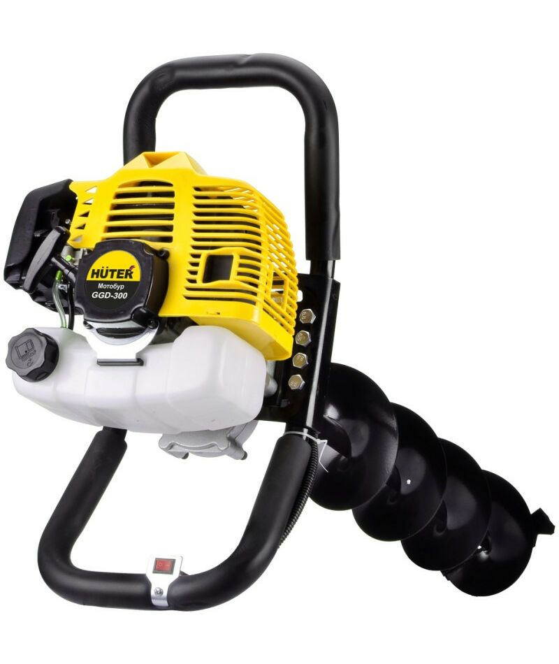 - Мотобур Huter GGD-300 используется для бурения отверстий в земле, это удобный инструмент для работы с грунтом и льдом. Благодаря сменным шнекам они позволяют получить отверстия разных диаметров. Бензобур находит применение в строительстве, коммунальном хозяйстве, на дачных участках или зимней рыбалке.