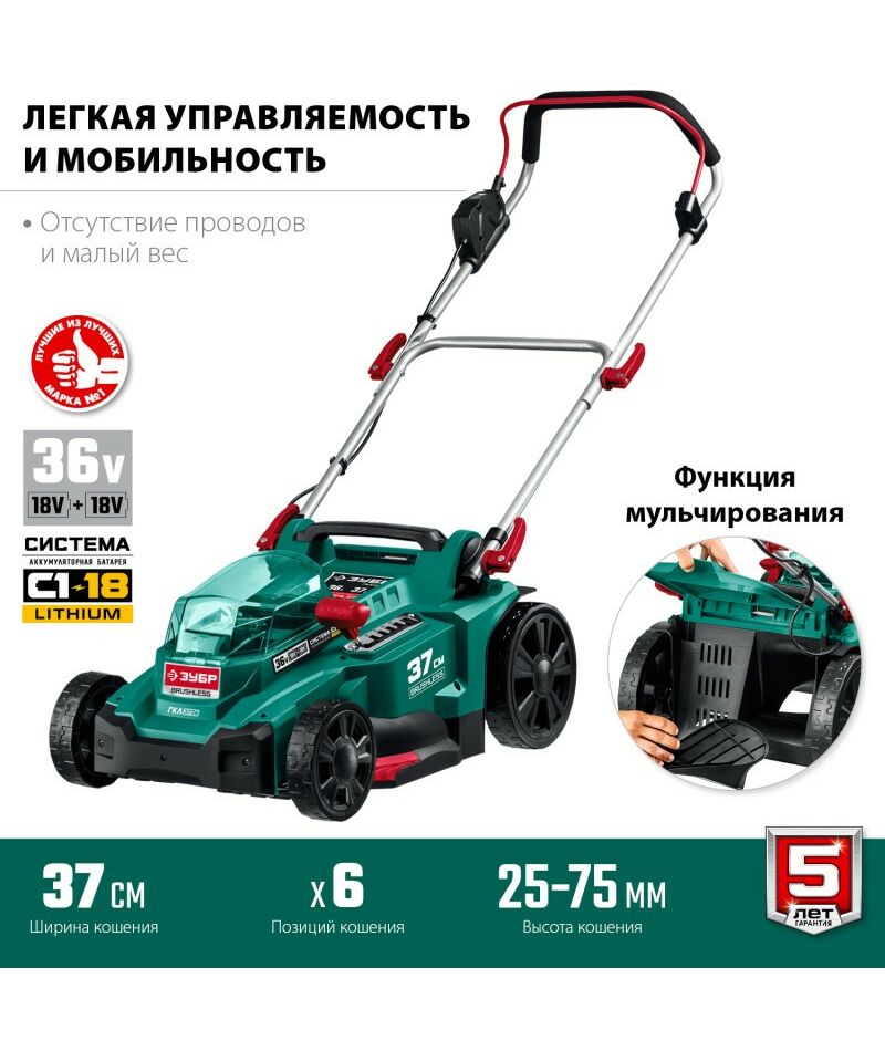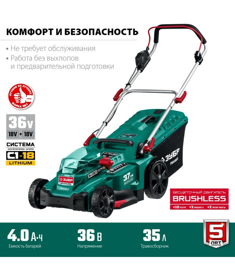Бесщеточная газонокосилка Зубр ГКЛ-3736 36В, без АКБ