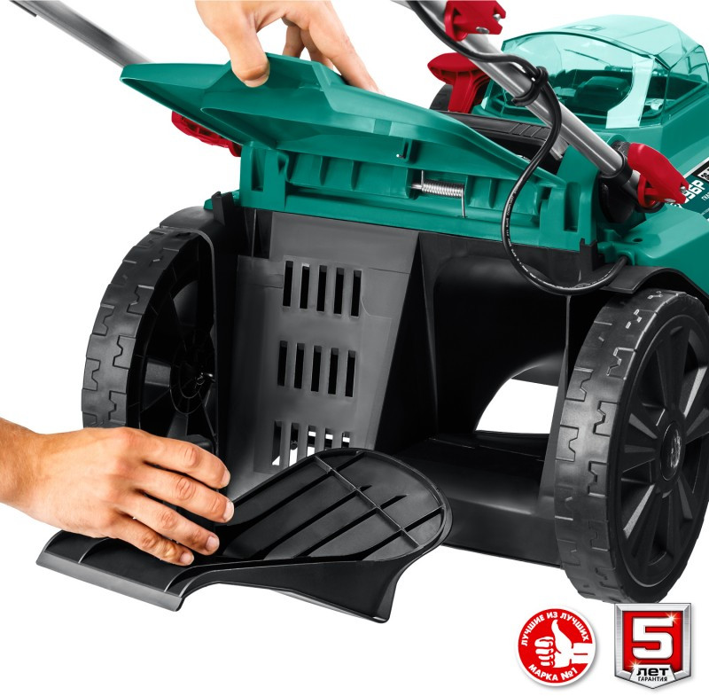 - Облегченные колеса и эргономичная рукоятка облегчают перемещение косилки по газону