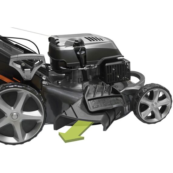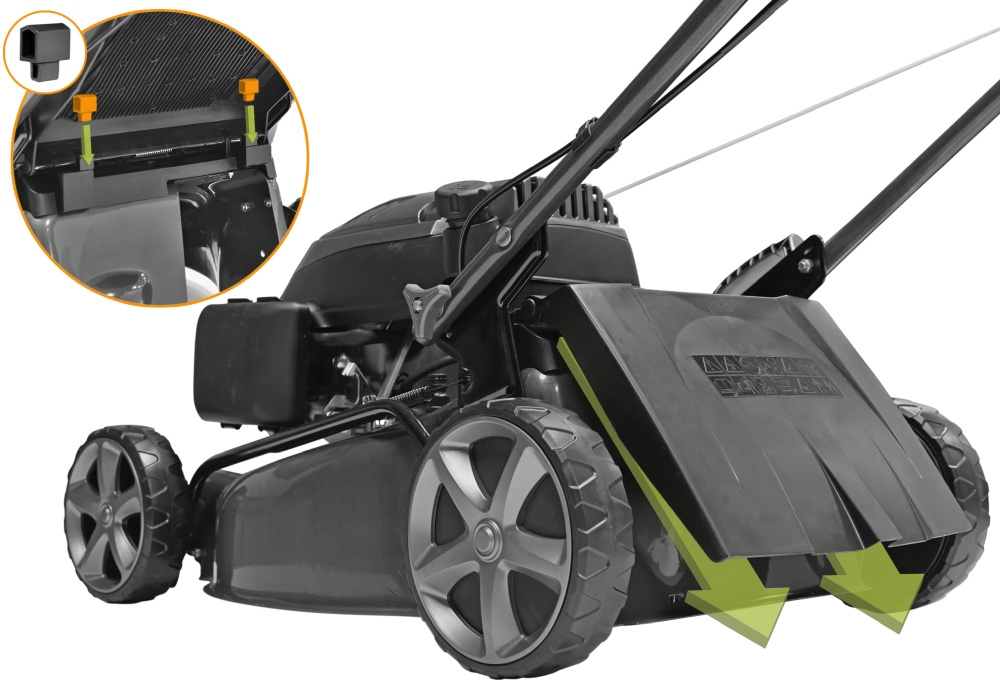 | Особенности | Три режима стрижки травы. Индикатор накопления травосборника. Система самоочистки AutoWash. Система измельчения травы для удобрения почвы. Вместительный травосборник 65 л. Центральный рычаг регулировки высоты скашивания. Регулируемая складная рукоятка. Прочная стальная дека. |