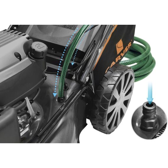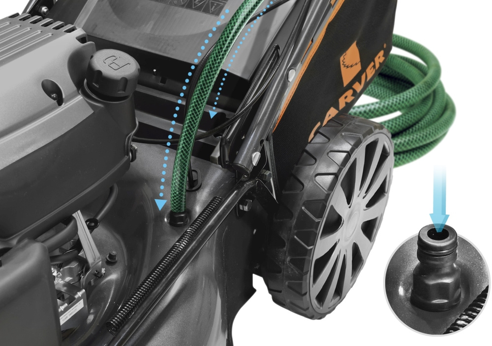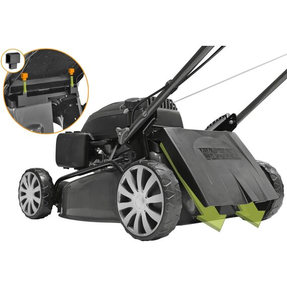 | Особенности | Три режима стрижки травы. Индикатор накопления травосборника. Система самоочистки AutoWash. Система измельчения травы для удобрения почвы. Вместительный травосборник 65 л. Центральный рычаг регулировки высоты скашивания. Регулируемая складная рукоятка. Прочная стальная дека. |