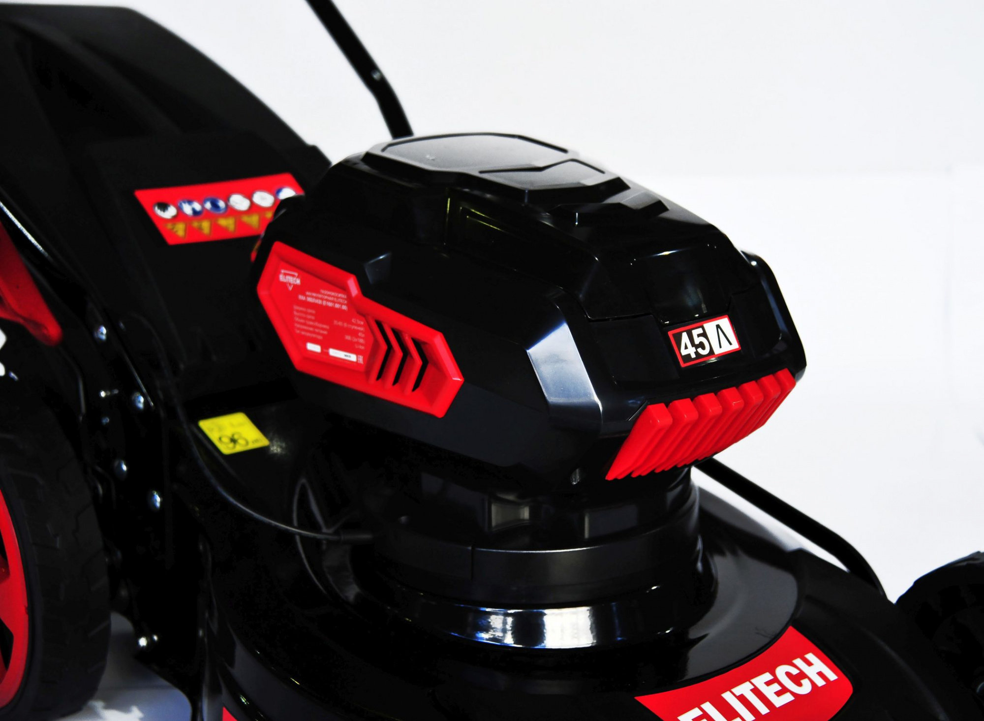 | Особенности | Работает от универсальных Li-Ion аккумуляторов Elitech BL мотор. Электронная защита двигателя от перегрузки. 8 уровней высоты скашивания. Защитная блокировка выключателя. Быстросъемный контейнер для травы. |
