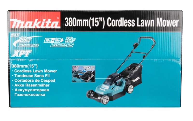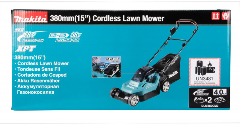 Газонокосилка аккумуляторная Makita DLM382 Li-ion 36В, B=38см, Н=20-75мм, 40л, 2х3Ач, 15кг