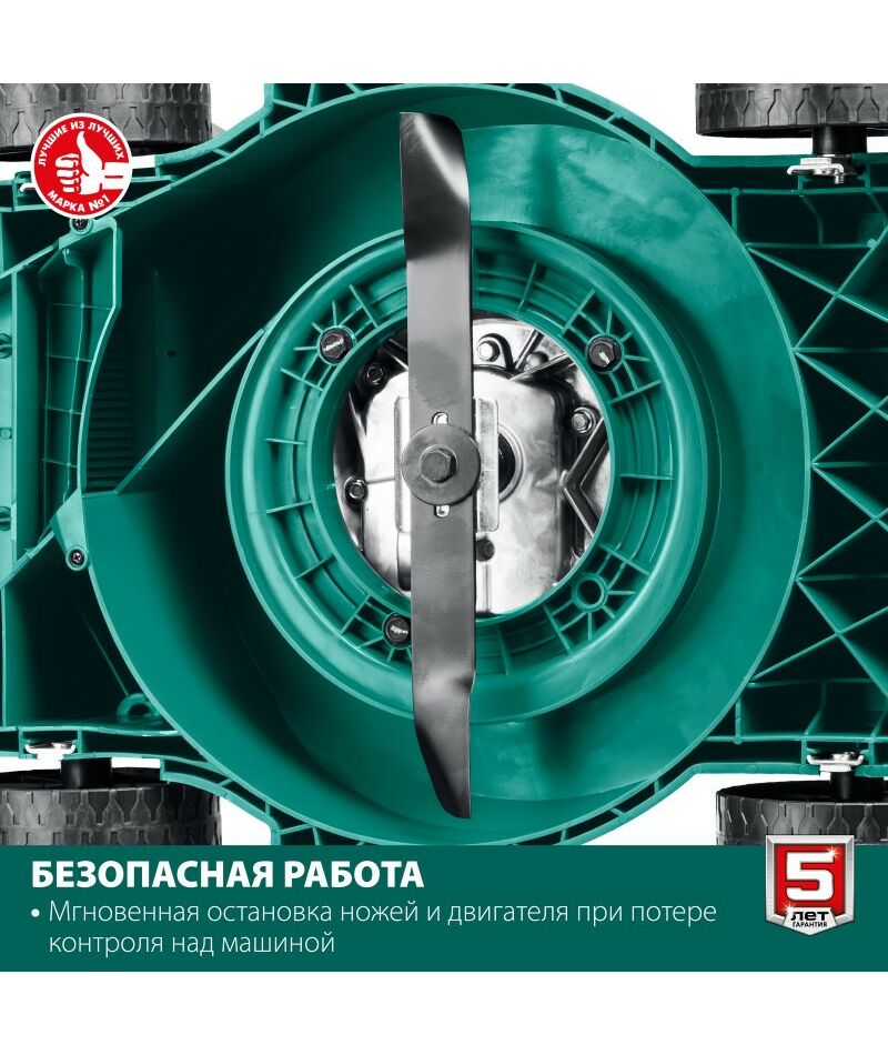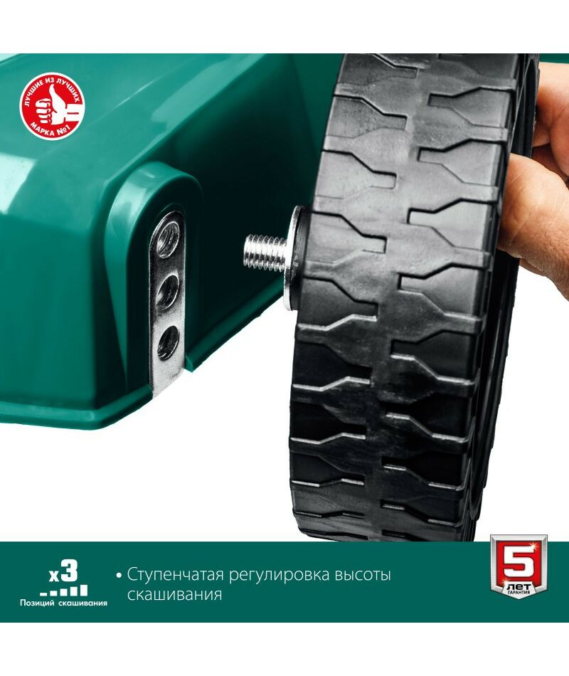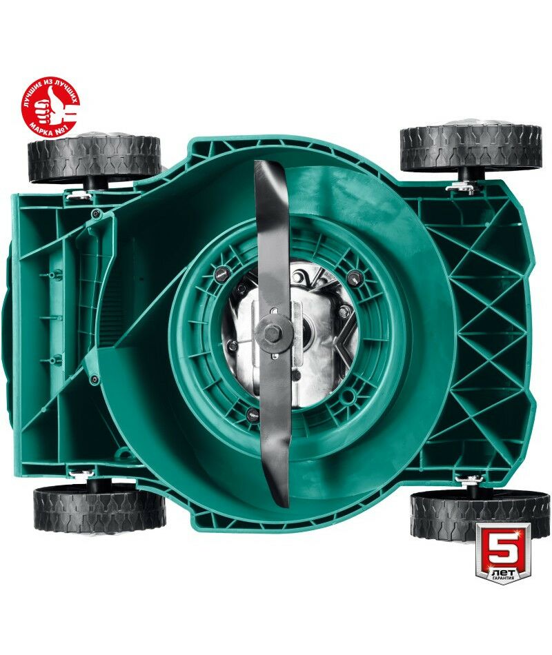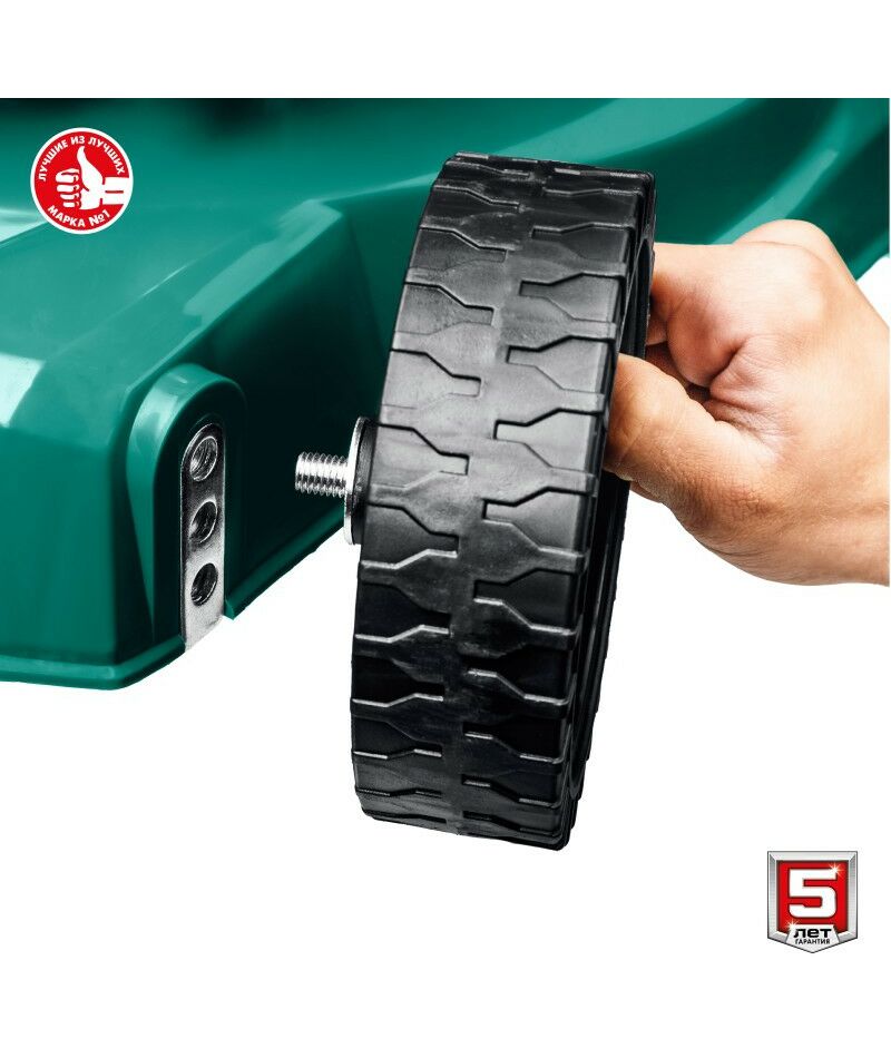 - Колеса увеличенного диаметра на подшипниках и эргономичная рукоятка облегчают перемещение косилки по газону