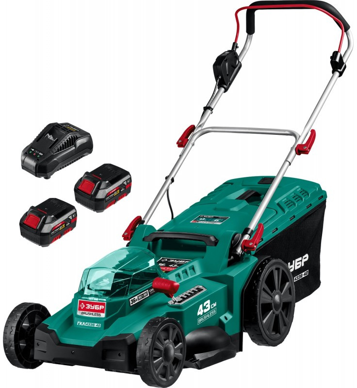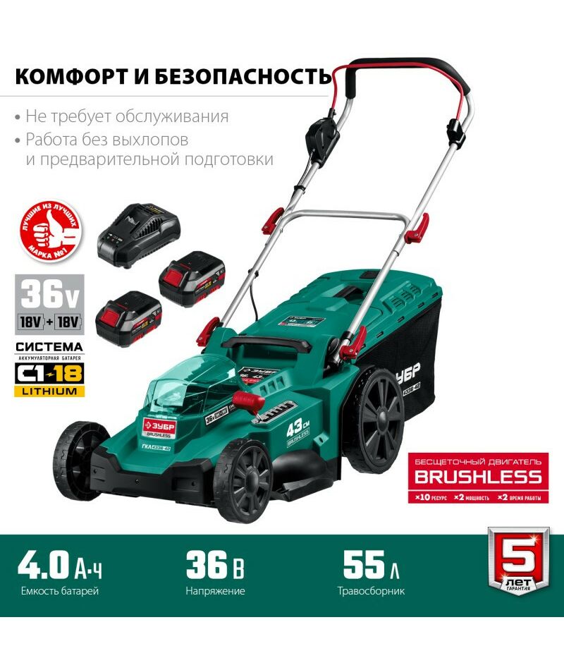 Бесщеточная газонокосилка Зубр ГКЛ-4336-42 36В, 2х18В АКБ (4Ач)