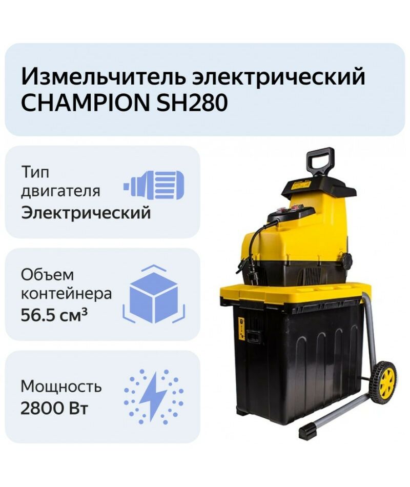 Измельчитель электрический Champion SH280 - устройство для измельчения садового мусора, веток и т.д. с целью превращения его в компост. Удобный в использовании, мобильный, имеет малый вес