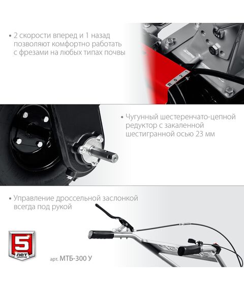 - 2 скорости вперед (основная и повышающая) и 1 назад позволяют комфортно работать на любых типах почвы