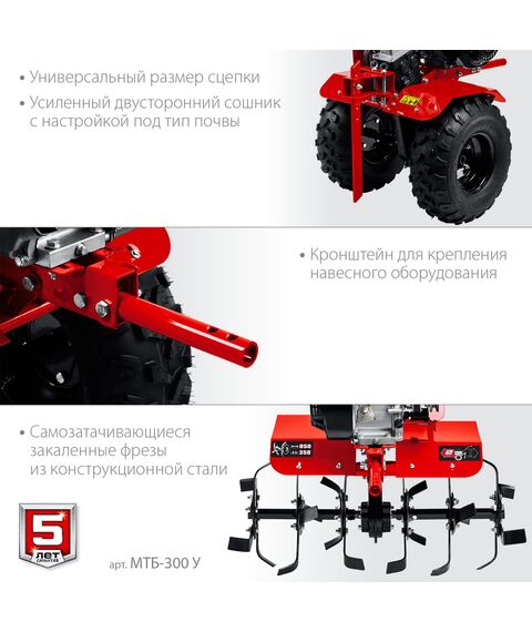- Универсальная сцепка позволяет использовать различное навесное оборудование