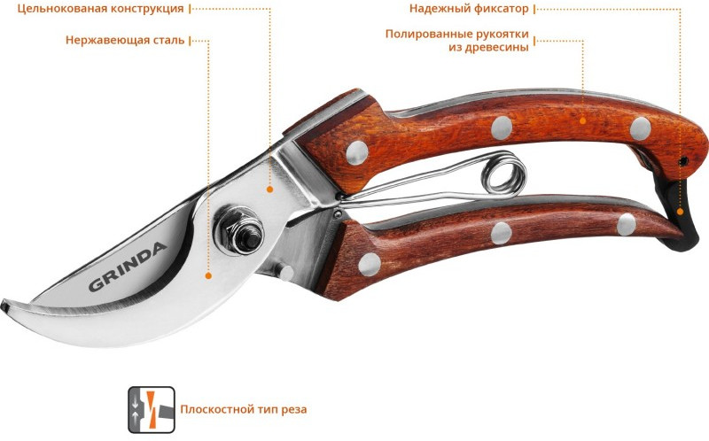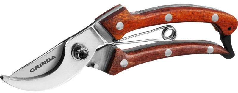 Цельнокованый компактный плоскостной секатор GRINDA PROLine P-17 195 мм, из нержавеющей стали, с деревянными рукоятками [423417]