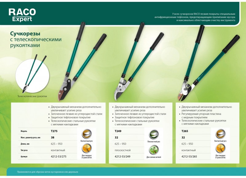 Сучкорезы RACO со стальными с телескопическими ручками оптимальны для работы с высоко растущими ветками. Благодаря специальному антифрикционному тефлоновому покрытию лезвий инструменты, идеально срезают ветки, надежны и обладают длительным сроком службы.