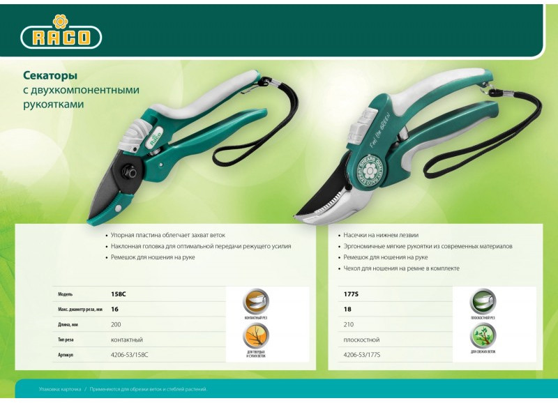 Безупречный дизайн секаторов RACO и эргономичные двухкомпонентные ручки обеспечивают высокую продуктивность и максимум комфорта при работе.