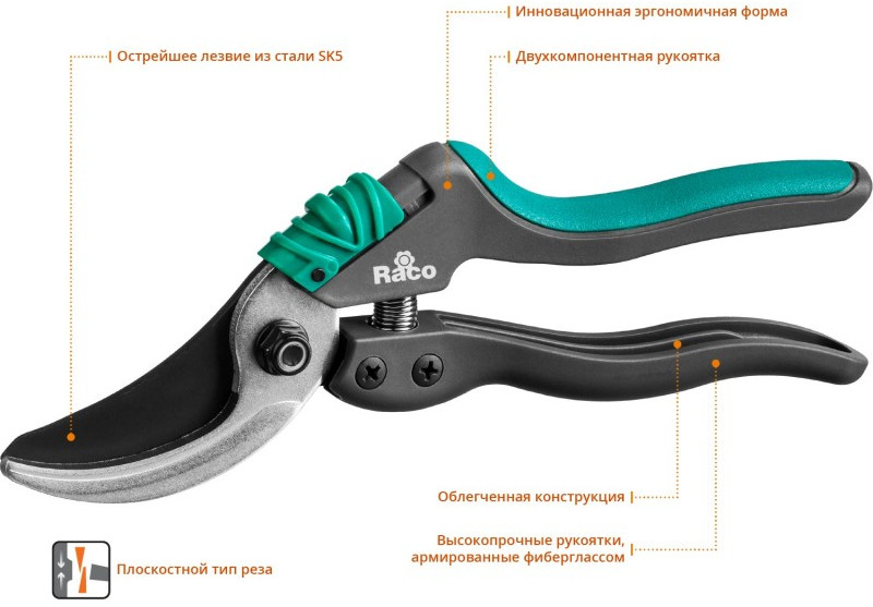 Высокое качество и лёгкость реза, удобство в работе и продолжительный срок службы секаторов RACO достигается за счёт современных материалов и технологий.