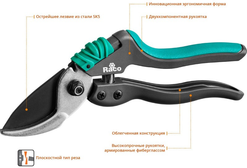Высокое качество и лёгкость реза, удобство в работе и продолжительный срок службы секаторов RACO достигается за счёт современных материалов и технологий.