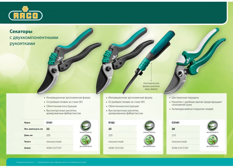 Высокое качество и лёгкость реза, удобство в работе и продолжительный срок службы секаторов RACO достигается за счёт современных материалов и технологий.