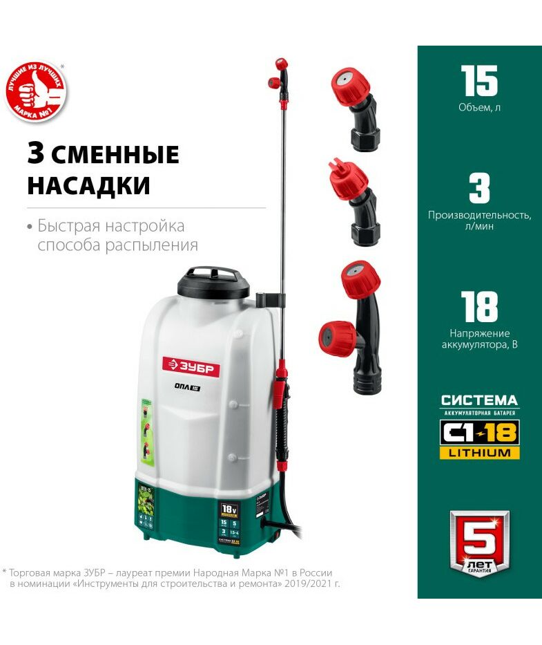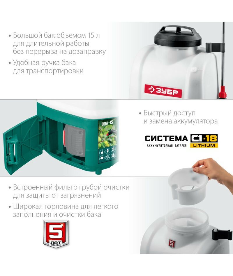 Опрыскиватель аккумуляторный Зубр ОПЛ-15 15 л бак, без АКБ, Li-Ion 18В