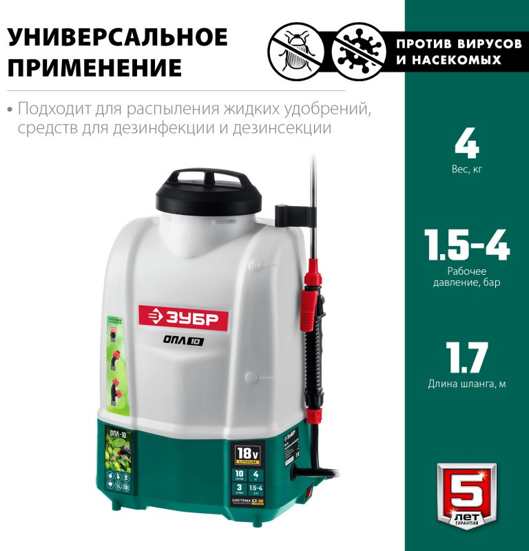 Опрыскиватель аккумуляторный Зубр ОПЛ-10 10 л бак, без АКБ, Li-Ion 18В