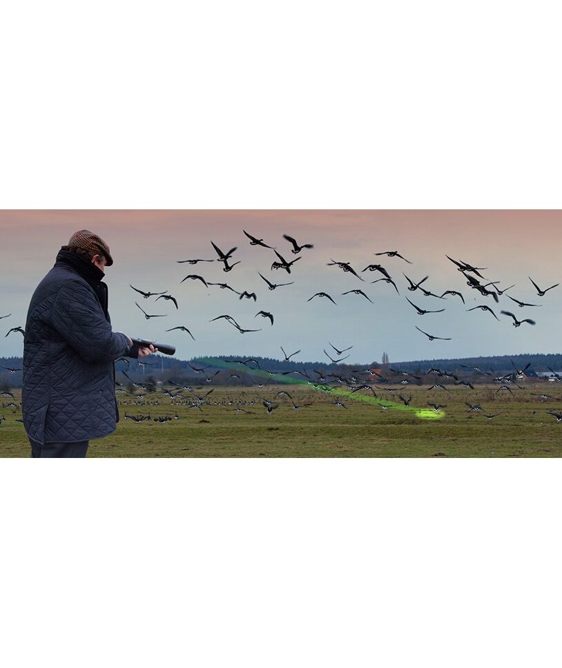 Отпугиватель выполнен в форме ручного фонарика и имеет многослойную стеклянную оптику, а также излучатель, который генерируют мощный лазерный луч зеленого цвета. Для птиц зеленый свет — это сигнал опасности. К тому же, яркие лучи лазера, попадая в глаза, вызывают болевые ощущения и тем самым усиливают чувство паники у пернатых. Ни одна птица не сможет выдержать такого воздействия и будет вынуждена покинуть ваш объект.