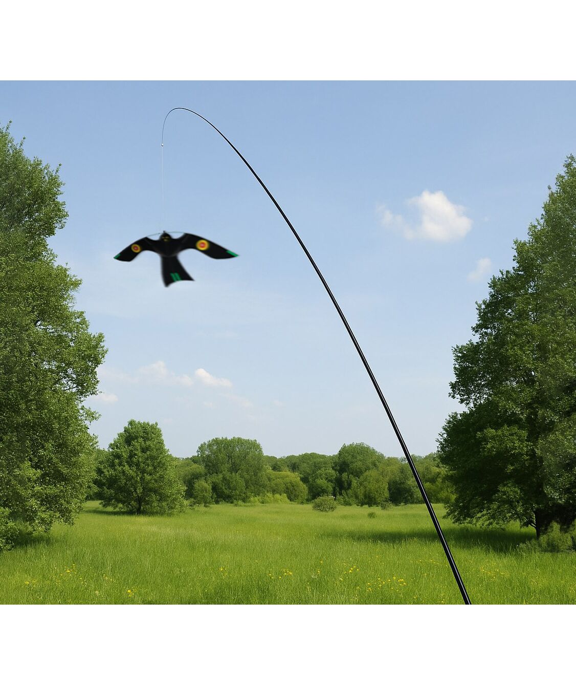 Принцип действия основан на инстинктах птиц, которые всегда, завидев в небе высматривающего добычу хищника, стараются улететь из опасного места как можно дальше. Так как отпугиватель не только выглядит в точности как живая птица, но и парит в небе, постоянно перемещаясь под действием ветра, ни одна, даже самая храбрая, пичуга не посмеет остаться поблизости. Ваш урожай будет в полной безопасности!