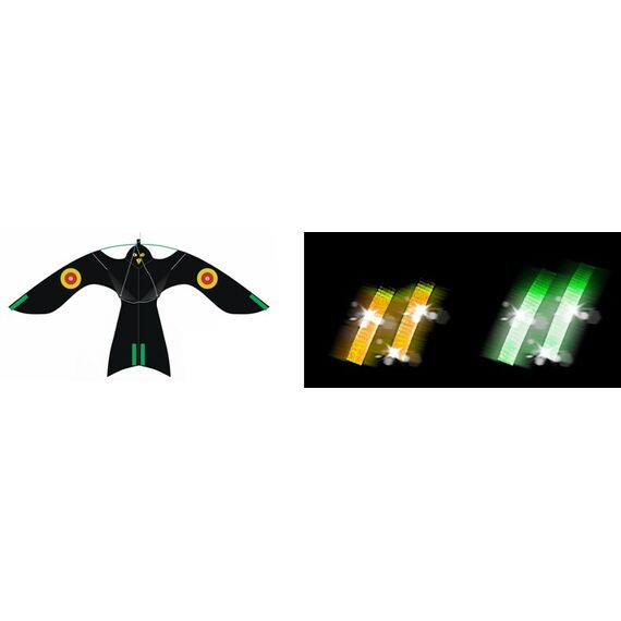 - изменили элементы на крыльях и хвосте на зеленые — для улучшения видимости в УФ спектре (имитация огня). Для птиц, прекрасно видящих в ультрафиолетовом диапазоне, воспринимается как открытое пламя, которого они очень боятся;
