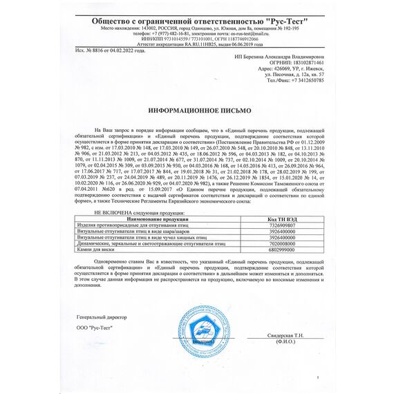 | Размер отпугивателя | 120 x 62 см (в собранном виде) |