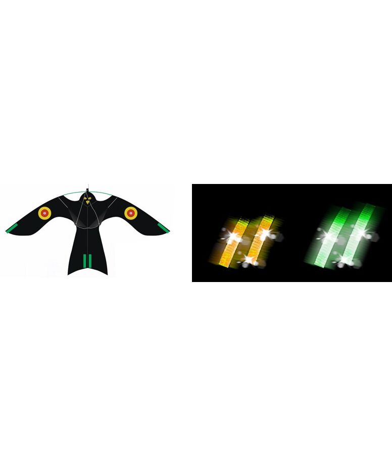 Усиливает эффективность действия биоакустических отпугивателей. При совместном использовании с популярными звуковыми отпугивателями, работающими на основе криков хищных птиц, эффективность отпугивания значительно возрастает, т.к. пернатые будут не только слышать, но и видеть своего врага.
