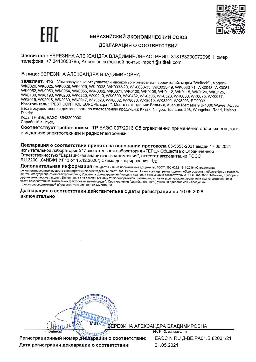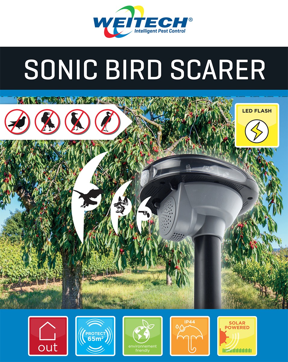 Функциональный звуковой отпугиватель птиц "Weitech WK-0025" способен защитить ваш огород, сад, дачу, двор или любую др. территорию площадью 65 м2 от птиц (голубей, скворцов, ворон, воробьев, чаек и т.д) и животных (кошек, собак, зайцев и пр.). Работает полностью автономно благодаря встроенной солнечной панели.