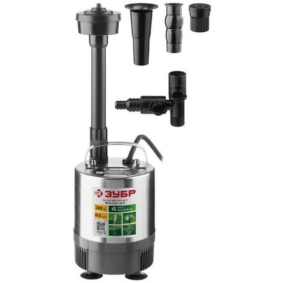 Насос фонтанный Зубр ЗНФЧ-23-1.9-C нерж. сталь, для чистой воды, напор 1,9 м, насадки: колокольчик, гейзер, каскад, 38 Вт, 23 л/мин