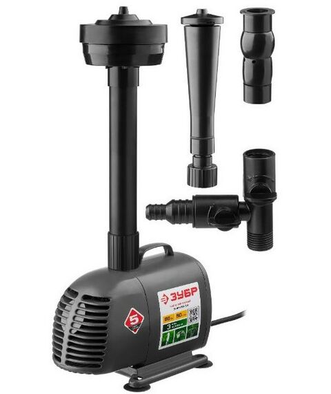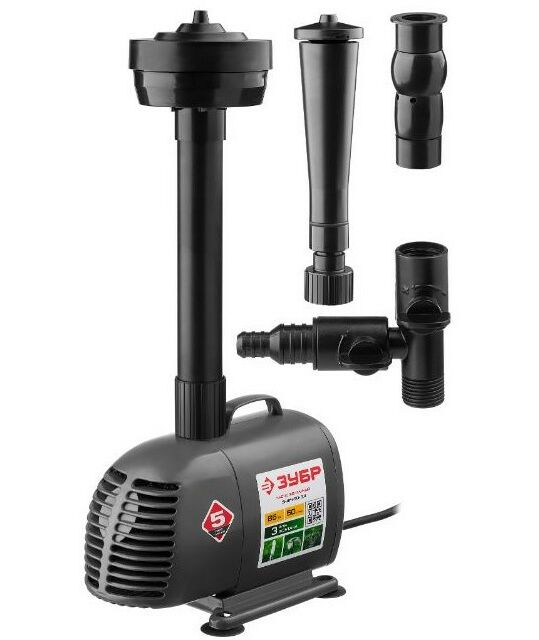 Насос фонтанный Зубр ЗНФЧ-50-3.4 для чистой воды, напор 3.4 м, насадки: колокольчик, гейзер, каскад, 85 Вт, 50 л/мин