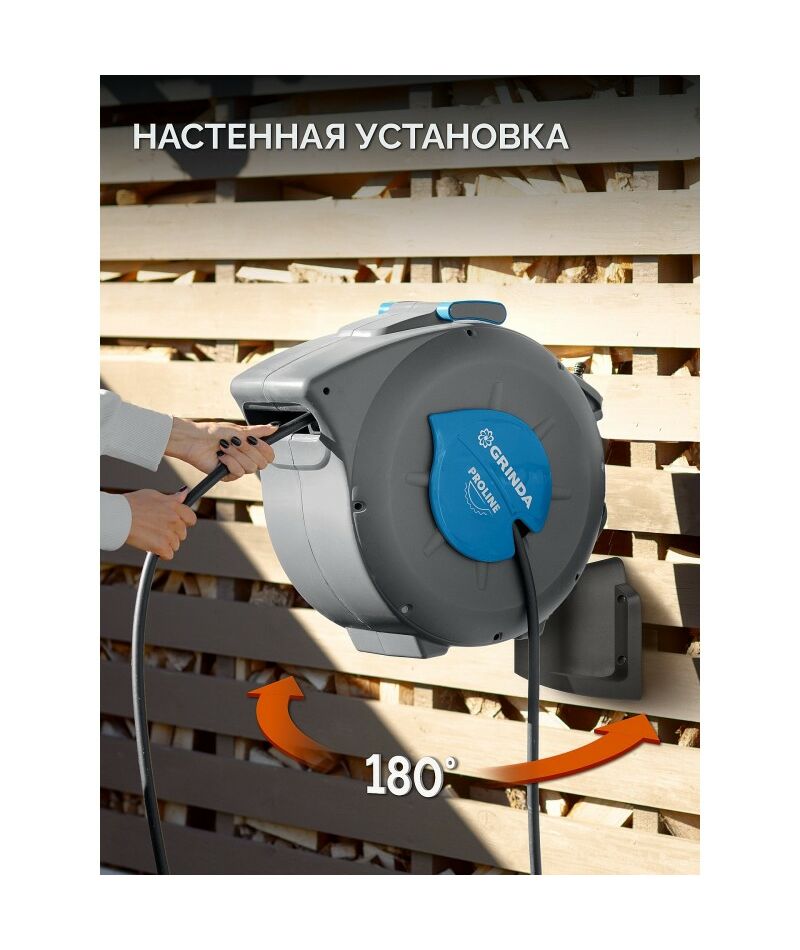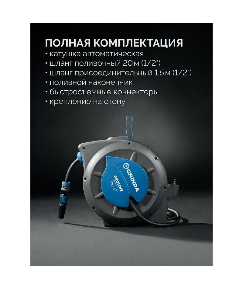Поливочный набор 4 предмета GRINDA HRA-20 шланг 20м x 1/2", на поворотном кронштейне настенная, катушка автоматическая со шлангом ProLine [428470]