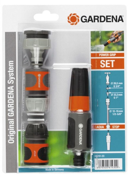 Комплект полива GARDENA Power Grip Set 1 штуцер резьбовой 26.5 мм (арт. 18202), 1 коннектор стандартный (арт. 18215), 1 коннектор стандартный с автостопом (арт. 18213), 1 наконечник для полива Classic (арт. 18300); для шлангов диаметром 13 мм (1/2) [18291