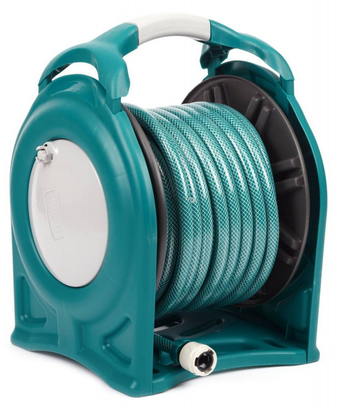 - Компактность катушки обеспечивает дополнительное удобство при хранении шланга и поливочной арматуры.