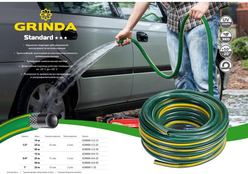 - Шланги GRINDA, изготовленные из качественного ПВХ, армированы прочнейшей синтетической нитью. Выдерживают широкий температурный диапазон без потери эластичности и прочности. В работе не скручиваются и не перегибаются. Совместимы со всеми элементами полива GRINDA и прочими современными поливочными системами.