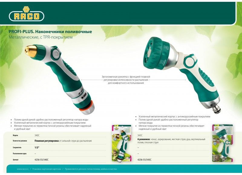 - Поливочные пистолеты-распылители RACO Profi Plus это продукт объединения новейших технологий с современным дизайном, конечным результатом которого являются инструменты класса ″люкс″. Обладают наивысшим качеством, самым длительным сроком службы и уровнем комфорта в использовании.