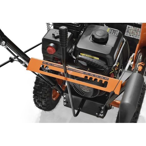 Самоходный снегоуборщик. Собранный снег выбрасывается на расстояние до 15 метров. Этот параметр регулируется, в том числе есть возможность выбрать сторону для сброса снежной массы. Используемая система шнеков – двухступенчатая. Ширина ковша составляет 560 мм.