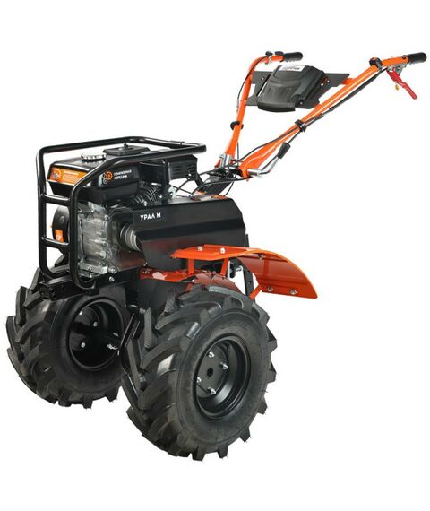 - Урал М - бензиновый мотоблок повышенного ресурса с пониженной передачей и цельнолитым чугунным цепным редуктором. Конструкция рамы облегчает транспортировку мотоблока и защищает четырехтактный двигатель. Переключение скоростей осуществляется с помощью 6-и ступенчатой коробки передач с пониженной и повышенной передачами. На универсальную сцепку можно установить навесное оборудование или тележку. В комплекте закаленные фрезы, широкие колеса с глубоким протектором, сошник. Кнопка включения, рукоятка газа и рычаг привода расположены на руле. Наклон руля регулируется.